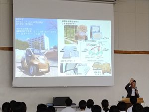 当日は、西村先生から、モビリティの話、植物材料の魅力、海外の動向、CNF等セルロース材料の研究開発などを講義するとともに、「しずおか もくまる」の実車を展示し、生徒たちは車体や部材を間近に見ることができました。